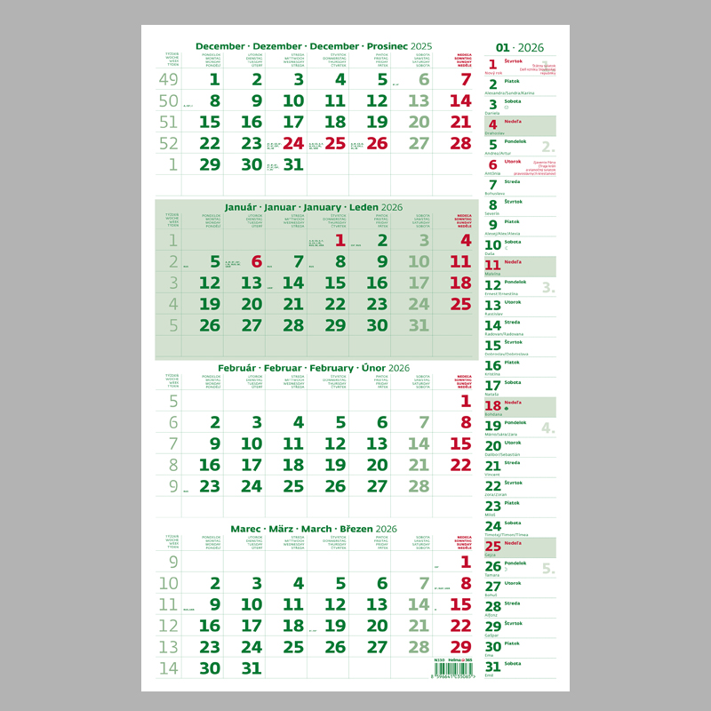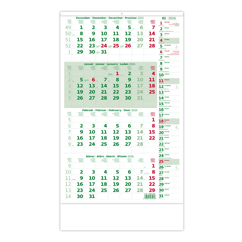 Formát kalendára: 31,5 x 49 cm• Kalendárium: slovenské štvormesačné menné + sviatky vybraných európskych štátov (CZ / SK / A / B / D / F / H / CH / I / PL / RUS / UKR)• Rozsah kalendára: 12 listov• Priestor na prítlač: 31,5 x 7 cm + laš: 31,5 x 18 cm