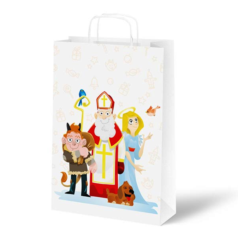 Mikulášska papierová darčeková taška, ideálna na balenie dobrôt, sladkostí a iných mikulášskych darčekov pre deti. S pevnou rukoväťou na riadne uchytenie darčeka.Rozmery: 180 x 240 x 80 mmUvedená cena je za 1 ks.