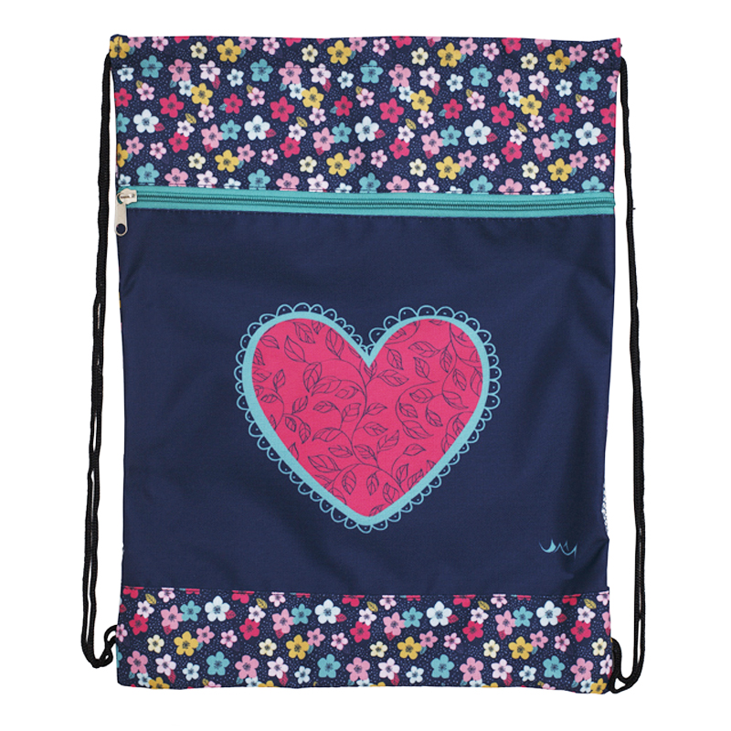 Vrecko sa sťahuje pomocou šnúrok, ktoré vedú cez celú zadnú časť a dá sa nosiť na chrbte alebo na ramene. Je vhodné na prezuvky alebo aj na oblečenie na telesnú výchovu alebo na každodenné nosenie. Rozmer: 32x42 cm.