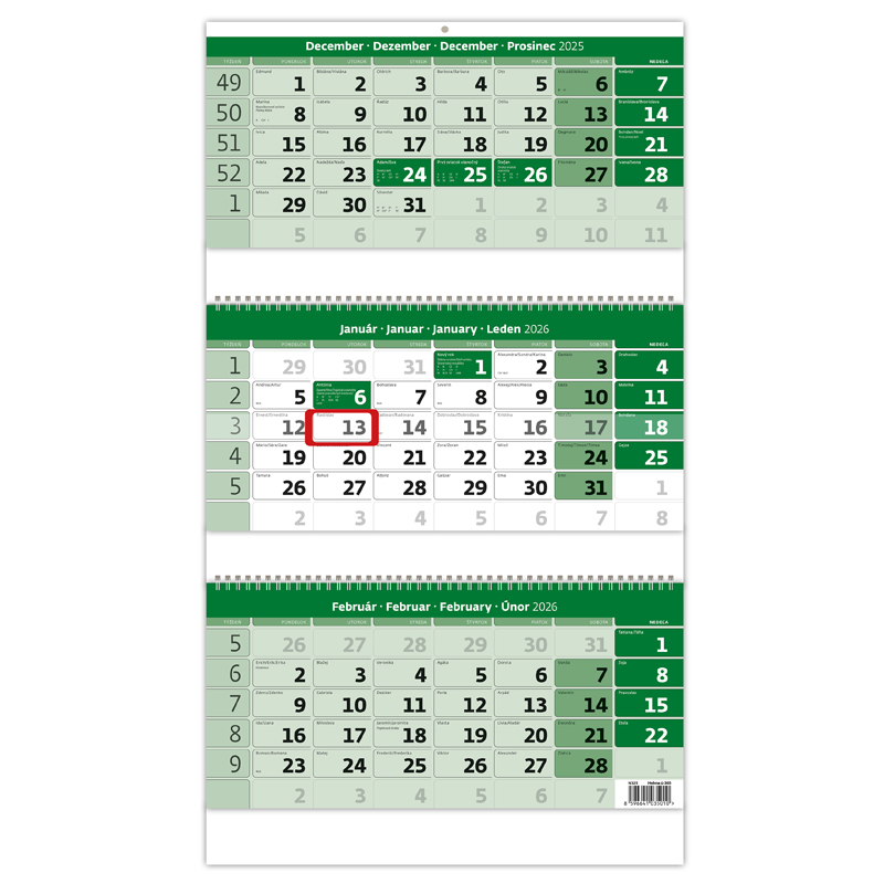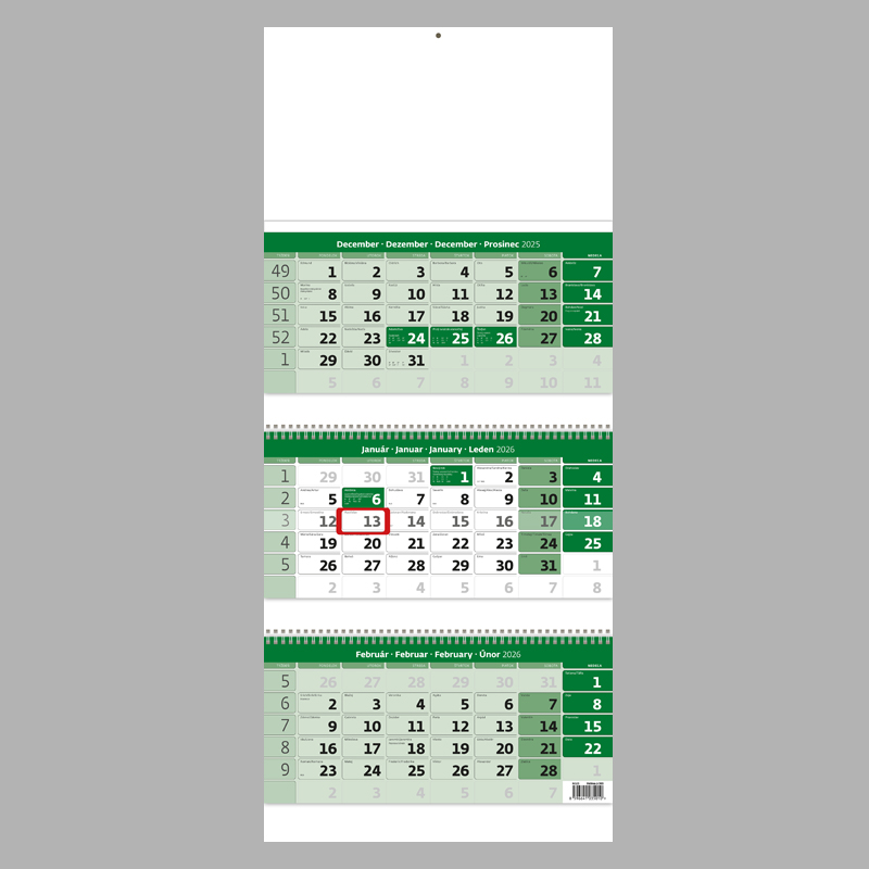 Formát kalendára: 31,5 x 55,5 cm + 18 cm • Kalendárium: slovenské trojmesačné menné so sviatkami európskych štátov (CZ / SK / A / B / D / F / H / CH / I / PL / RUS / UKR) • Rozsah kalendára: 3 x 12 listov • Priestor na potlač: 31,5 x 3,5 cm + laš: 31,5 x 18cm. Zložený kalendár: 31,5 x 18,5 cm Vôjde sa do obálky B4