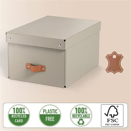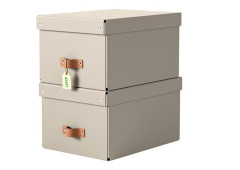 Súprava dvoch stredne veľkých úložných boxov s vekom vyrobených zo 100% recyklovanej lepenky s certifikátom FSC v modernom a čistom dizajne, ktorý doplní vašu domácnosť aj kanceláriu.