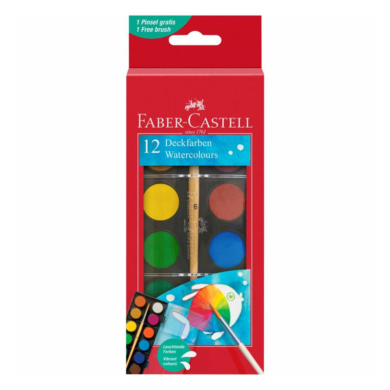 Vodové farby Faber Castell 12 farebné, 24 mm Vodové farby Vodové farby vhodné do školy a na voľný čas. Žiarivé a jasné farby s dobrou krycou schopnosťou. Neobmedzené možnosti miešania farieb pri maľovaní na papier aj iné povrchy. Pre zábavné maľovanie. Súčasťou balenia je štetec. · Trvácny kvalitný pigment · Dobré krycie schopnosti · 12 farieb s priemerom 24 mm · Rozpustné vo vode · Pevný plastový obal