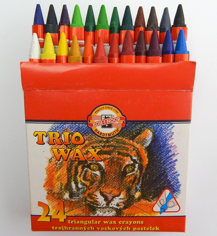Voskové 24-farebné trojhranné školské farbičky TRIO WAX v papierovej krabičke. Dĺžka 90 mm, hrúbka farbičky 8,2 mm.